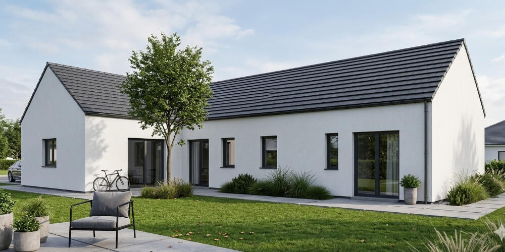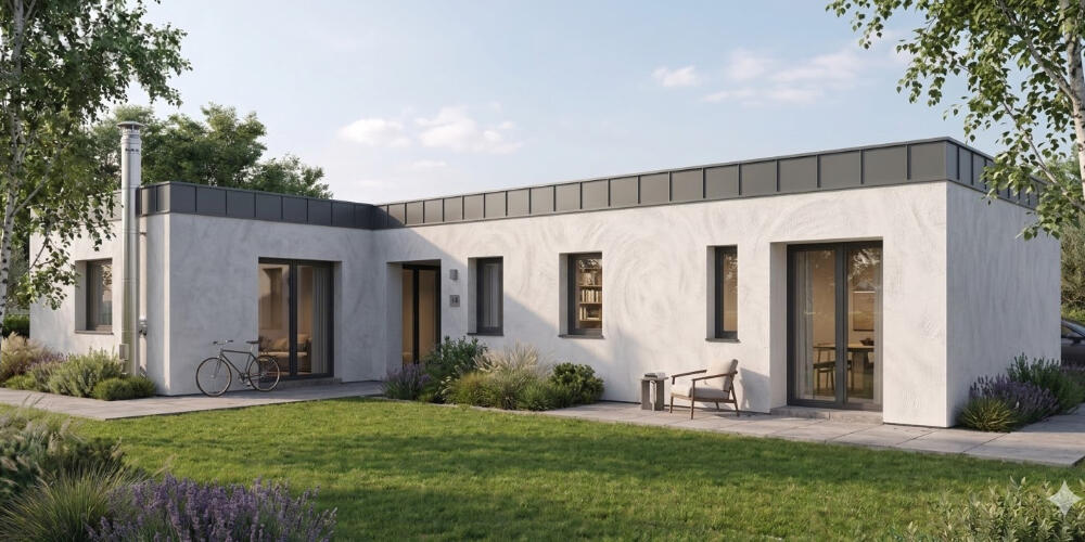 Rodinný bungalov 4+kk ve verzi se sedlovou nebo plochou střechou o užitné ploše 100 m² v energetické třídě B.Cena: 3 870 000 Kč bez DPH.Dům je navržen v konstrukčním systému cihla Heluz Family se zateplením 160 mm šedého polystyrenu a okny s izolačními trojskly. Vytápění zajišťuje tepelné čerpadlo v kombinaci s podlahovým vytápěním. Důraz je kladen na dlouhodobě nízké provozní náklady, bezúdržbost a komfort bydlení.