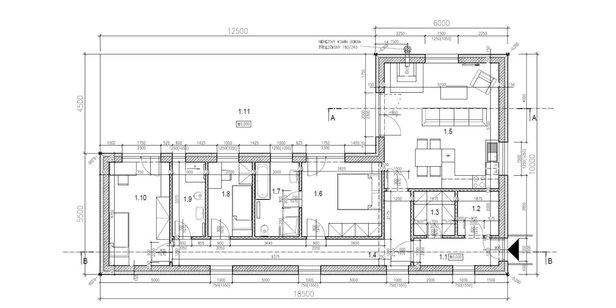 Rodinný dům 4+kk o zastavěné ploše 100 m², energetická třída B, zděná konstrukce Heluz Family, zateplení 160 mm šedým EPS, trojskla, tepelné čerpadlo, podlahové vytápění a betonová střešní krytina KM Beta.
