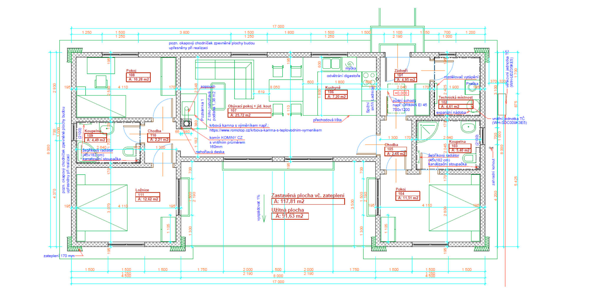TZB: tepelné čerpadlo Airwell v kombinaci s podlahovým vytápěním; doplňkové krbové vytápění s nerezovým třísložkovým komínem Bokra; hromosvod; příprava pro FVE